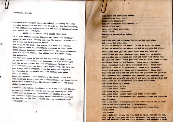 Kriwet, Ferdinand: Zweiteiliges Typoskript. o. O. [Düsseldorf]. o. V. [Selbstverlag]. o. J. [Anfang 1970er Jahre]. 29,8 x 21 cm. 10 S.; 24 S. Büroklammern verrostet. Typoskript stark nachgedunkelt, angestaubt, stockfleckig und berieben. Matrizendruck angestaubt, linksseitig gelocht und fingerfleckig. Zweiteiliges, persönliches Typoskript von Ferdinand Kriwet (1942 – 2018) aus den frühen siebziger Jahren mit privaten biographischen und künstlerischen Informationen und Statements, ergänzt durch politische Kommentare zur Situation der Zeit mit Verweisen zu bildender Kunst, Musik und Literatur. Ein Typoskript auf dünnem Durchschlagpapier besteht aus 10 paginierten Seiten mit kleinen handschriftlichen Ergänzungen und Untersteichungen [des Künstlers?]. Der Matrizendruck besteht aus 24 paginierten Seiten und enthält auch wenige Unterstreichungen und kleine Ergänzungen. Selten!