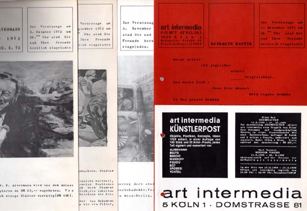 Rywelski, Helmut (Herausgeber): Konvolut Galerieinfos & Ephemera. Köln. art intermedia. 1970 – 1972. Diverse Formate bis 29,7 x 21 cm. [29] unpaginierte Blätter. Blätter teilweise gelocht, angestaubt, lichtspurig, nachgedunkelt und berieben. Wenige Blätter etwas angeschmutzt. Sonst ordentliche bis noch gute Exemplare. Konvolut von hektografierten Publikationen und Ephemera des Kölner Galeristen Helmut Rywelski, „der zwischen 1967 und 1972 mit seiner Galerie art intermedia und der Kritik am kommerziellen Kunstbetrieb für Furore sorgte. Nur knappe fünf Jahre hat der Journalist Helmut Rywelski seine Galerie art intermedia in Köln betrieben, aber diese fünf Jahre hatten es in sich. Er vertrat Kunst ‚in und zwischen allen Medien‘ in einer Zeit der dynamischen Medialisierung des öffentlichen Lebens. Insbesondere sozial engagierte, kritische und politische Kunst war sein Thema, und solange er selbst Teil des neuen Kunstmarkts war, bekämpfte er diesen zugleich, bis er nach fünf Jahren in der Erkenntnis der unaufhaltsamen Ökonomisierung des Kunstbetriebes kapitulierte“ (ZADIK Cologne Galleries). Die kleine Sammlung besteht aus vier postalisch gelaufenen, mit Infos und Abbildungen bedruckten Briefumschlägen, vier dreiteiligen Einladungsklappkarten (zum Versand gefaltet), zwei Blättern „Künstlerpost“, [18] unpaginierten Blättern mit hektografierten Anschreiben und Galerieinfos sowie einem kleinen Aufkleber für den „Internationalen Markt für aktuelle Kunst“ in Düsseldorf im Jahre 1972. Eines der Anschreiben für die Kunden der Galerien von Rywelski in rotem Faserschreiber handschriftlich signiert. Mit Hinweisen zu Arbeiten von Alvermann, Beuys, Brecht, Nierhoff, Filliou, Rot, Spoerri, Vostell u. a. Interessantes Zeitdokument. Recht selten!