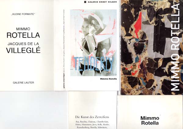 Rotella, Mimmo: Fünfteiliges Konvolut von Einladungskarten. Erste Auflage. Diverse Orte. Diverse Verlage. 1989 – 2012. Diverse Formate. 10 Blatt. Guter Zustand. Kleines Fünfteiliges Konvolut von Einladungskarten zu Einzelausstellungen und Ausstellungsbeteiligungen des italienischen Künstlers Mimmo Rotella (1918 – 2006), der für seine Dcollagen berühmt war. Zumeist mit farbigen Abbildungen von Arbeiten des Künstlers.