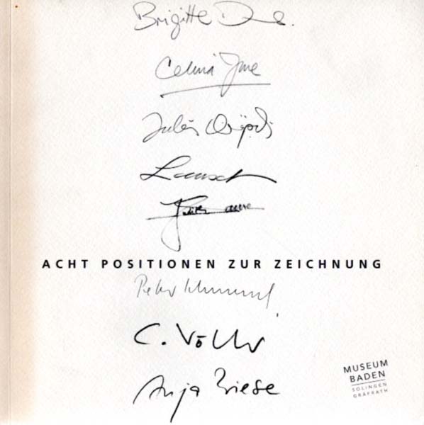 Elbracht-Iglhaut, Gisela (Herausgeberin): Acht Positionen zur Zeichnung. 8. November 2002 bis 5. Januar 2003. Museum Baden. Solingen Gräfrath. Erste Auflage. Solingen. Museum Baden. 2002. 21 cm, 350 gr. 43 S.; 4 Blatt. OKarton mit faksimilierten Signaturen der Künstler. Einband lichtrandig, ganz leicht angestaubt und wenig nachgedunkelt. Sonst gutes Exemplar. Durchgehend mit meist farbigen Abbildungen versehen. Katalog zur gleichnamigen Gruppenausstellung. Mit Arbeiten von Brigitte Dams, Celina Jure, Julia Kröpelin, Stefan Lausch, Judith Samen, Peter Schmersal, Cornelius Völker und Anja Wiese. Auf dem Titelblatt von Brigitte Dams, Anja Wiese, Stefan Lausch, Judith Samen und Peter Schmersal in Kugelschreiber signiert.