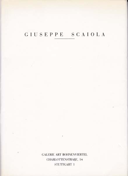 Scaiola, Giuseppe: Giuseppe Scaiola. Erste Auflage. Stuttgart. Galerie Art Bohnenviertel. 1989. 12 x 15,5 cm. 93 S. OPappband mit OUmschlag. Umschlagkanten etwas lichtrandig. Sonst sehr gutes Exemplar. Durchgehed mit farbigen Werkabbildungen versehen. Text in deutscher und italienischer Sprache.