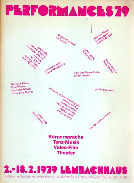 Friedel, Helmut [Herausgeber]: Performances 79. Körpersprache. Tanz-Musik. Video-Film. Theater. Erste Auflage. München. Städtische Galerie im Lenbachhaus. 1979. 28 x 20 cm. 71 S. Okarton. Einband etwas berieben und lichtrandig, Schnitt gering gebräunt, einige marginale Bleistiftanstreichungen auf zwei Textseiten. Sonst gutes Exemplar. Katalog zur Ausstellung im Lenbachhaus München vom 2. bis zum 19. 2. 1979, „um erstmals in München diese Form der künstlerischen Darstellung … zu zeigen“ (Aus dem Vorwort). Teilnehmer waren bekannte Namen wie Rainer, Roth, Nitsch, Rühm. Plessi, Export u.a. Durchgehend mit s/w-Abbildungen versehen.