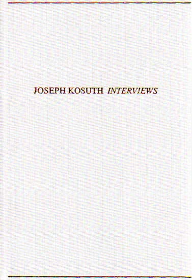 Kosuth, Joseph: Interviews. 1969-1989. 1. Auflage. Stuttgart. Edition Patricia Schwarz. 1989. 21 x 14 cm. 159 S. OLeinen. Gutes bis sehr gutes Exemplar. Texte in Englisch. Mit einem Vorwort von Charles Le Vine und 15 Interviews. Enthält einige Abbildungen, teilweise in Farbe.