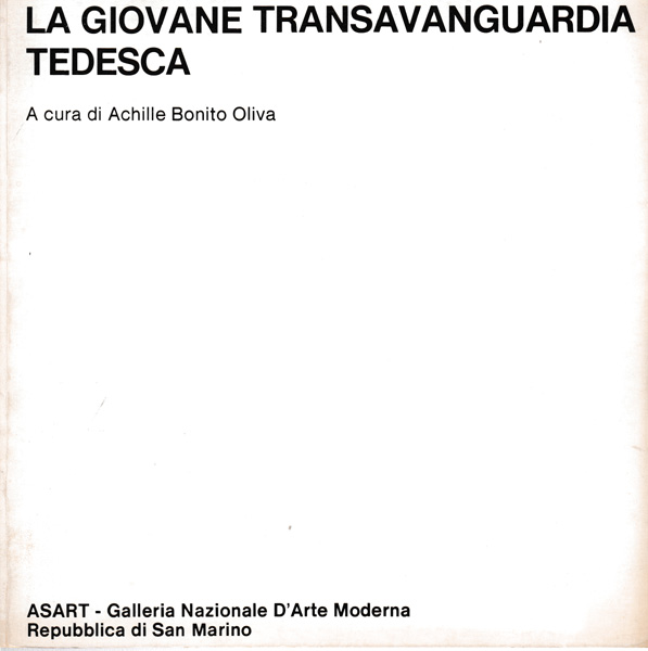Oliva, Achille Bonito [Herausgeber]: La Giovane Transavanguardia Tedesca. Erste Auflage. S. Marino. ASART – Galleria Nazionale d’Arte Repubblica di S. Marino. 1982. 20,5 x 20,5 cm. 94 S. OKarton. Einbandkanten etwas nachgedunkelt und mit kleinen Bereibungen, leicht angestaubt. Sonst gutes Exemplar. Katalog zur Ausstellung S. Marino 31. Oktober bis 12. Dezember 1982 durchgehend mit s/w-Abbildungen versehen. Ausgestellte Künstler waren Adamski, Banana, Barfuss, Bauch, Bömmels, Dahn, Dokoupil, Fetting, Middendorf, Oehlen, Salome, Tannert, Zimmer, Wachweger, Weideman. Mit mehrzeiliger, eigenhändiger Widmung von Walter Dahn ( S. 45) an einen Düsseldorfer Sammler.